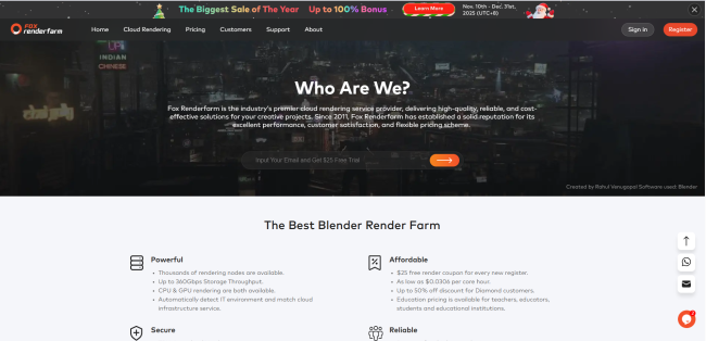 Fox Renderfarm is also one of the best render farms for Blender with a long-established SaaS model and it is widely used in commercial and animation projects. For Blender artists, it offers a stable, large-scale rendering environment suited to handling high frame counts and deadline-driven Cycles workloads.